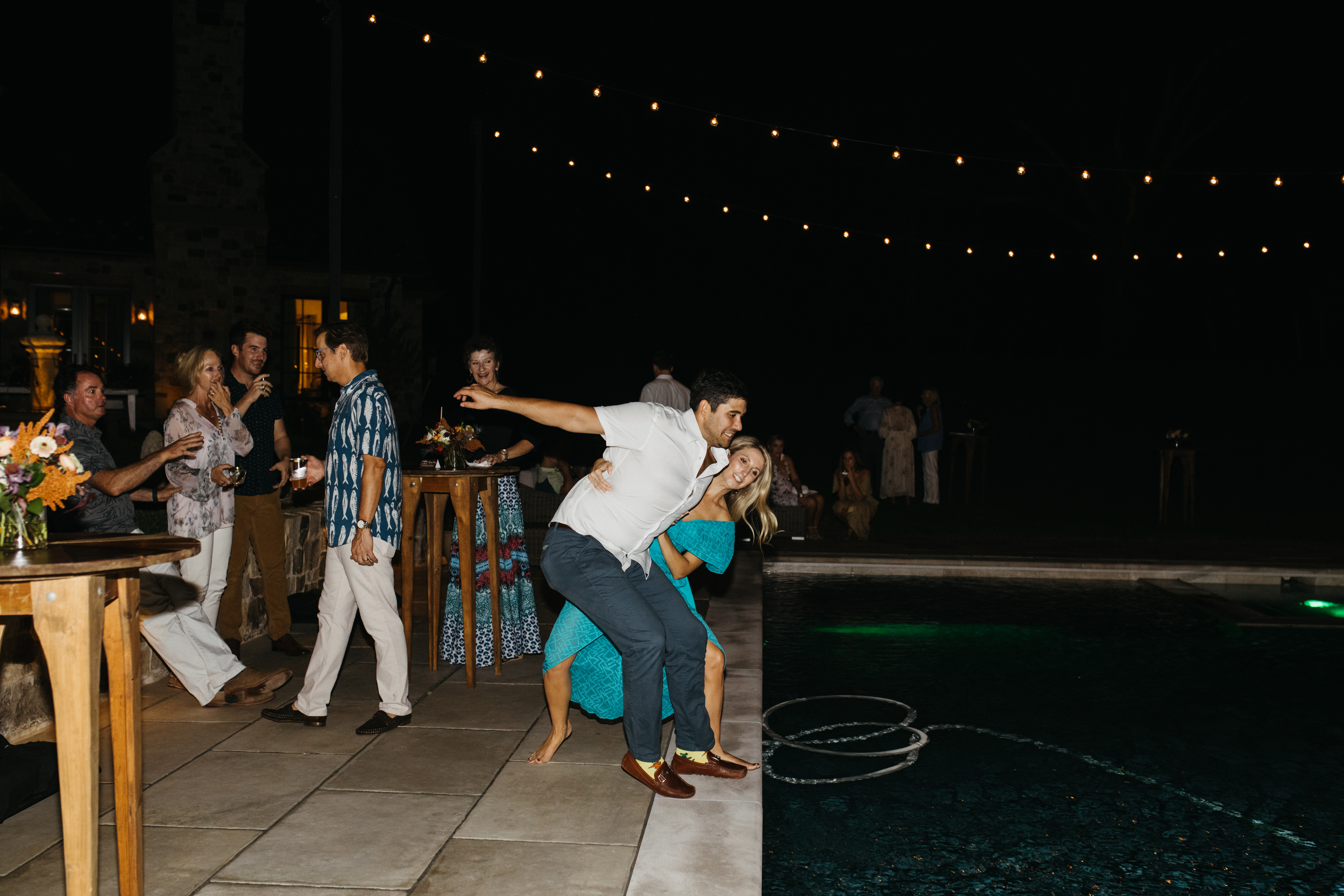 As the party went on, and the sun started setting, the family lit up the fire pit. There were home tours, great food, exciting cocktails, and great conversations by the fire.  The bride impressed everyone with her sabrage skills, and in an attempt to throw her fiancé in the pool, she ended up in the pool herself.  One of the future groomsmen saw the opportunity and the groom and bride both ended up in the pool together.  It made for a great ending to the evening and some really cute photos.