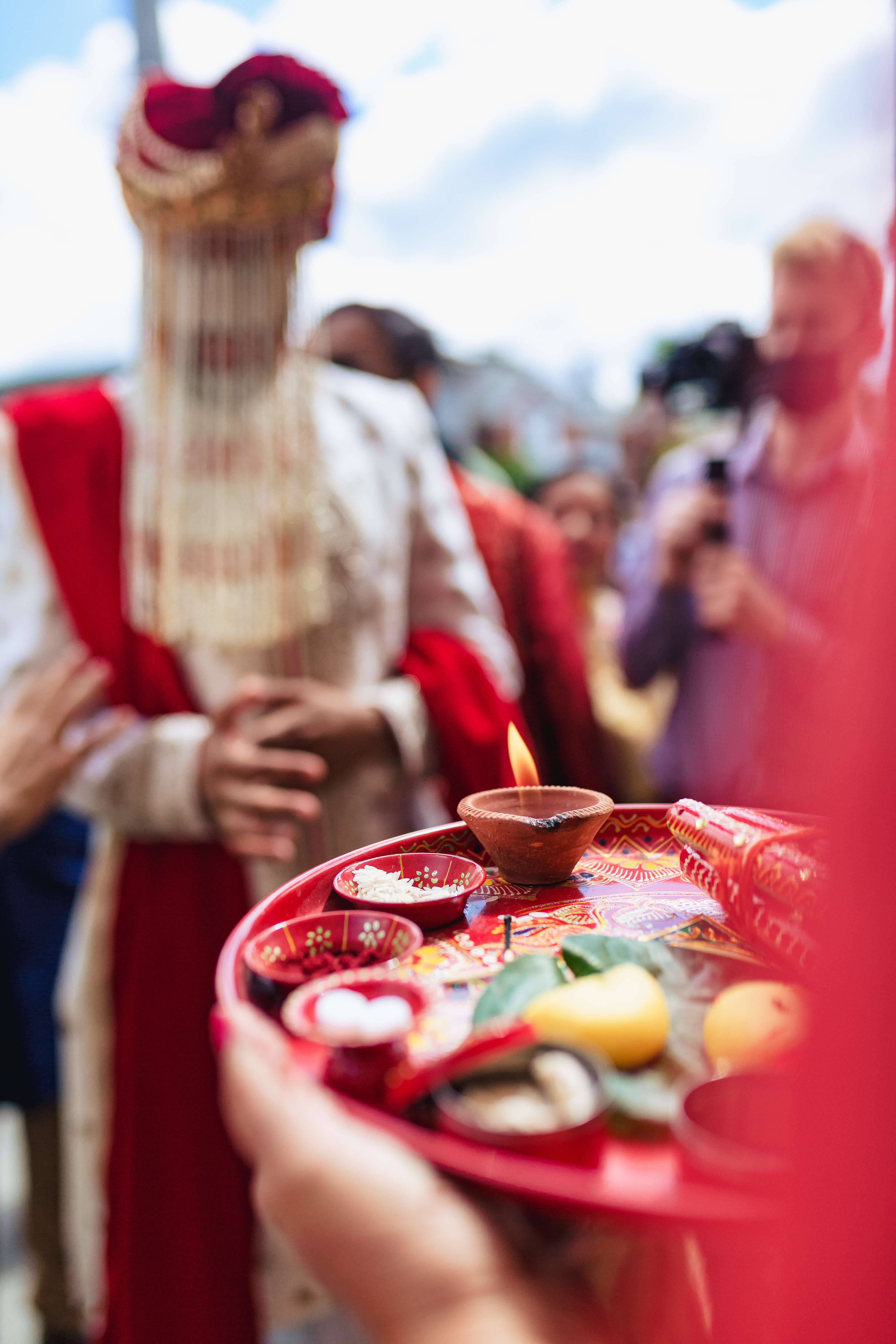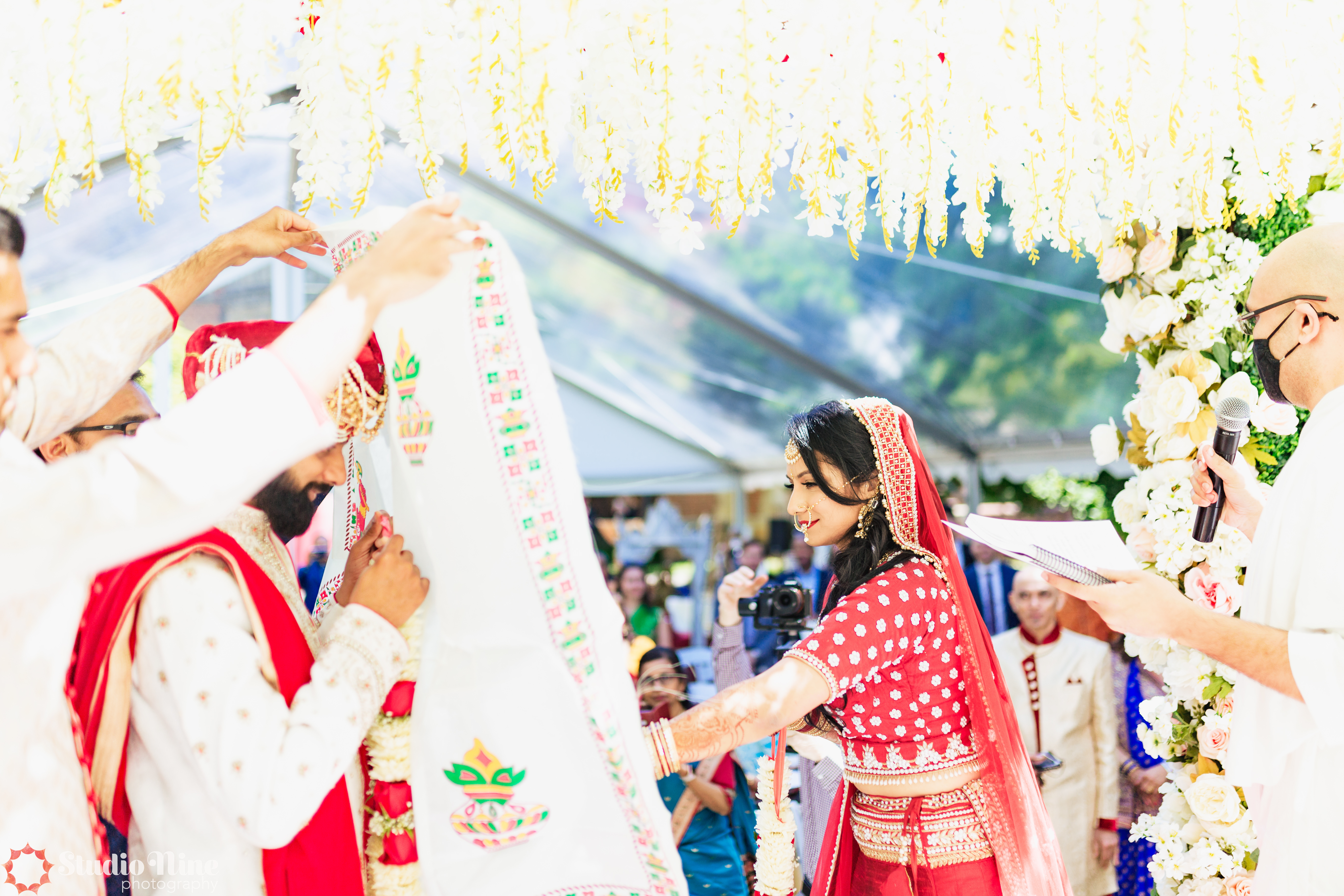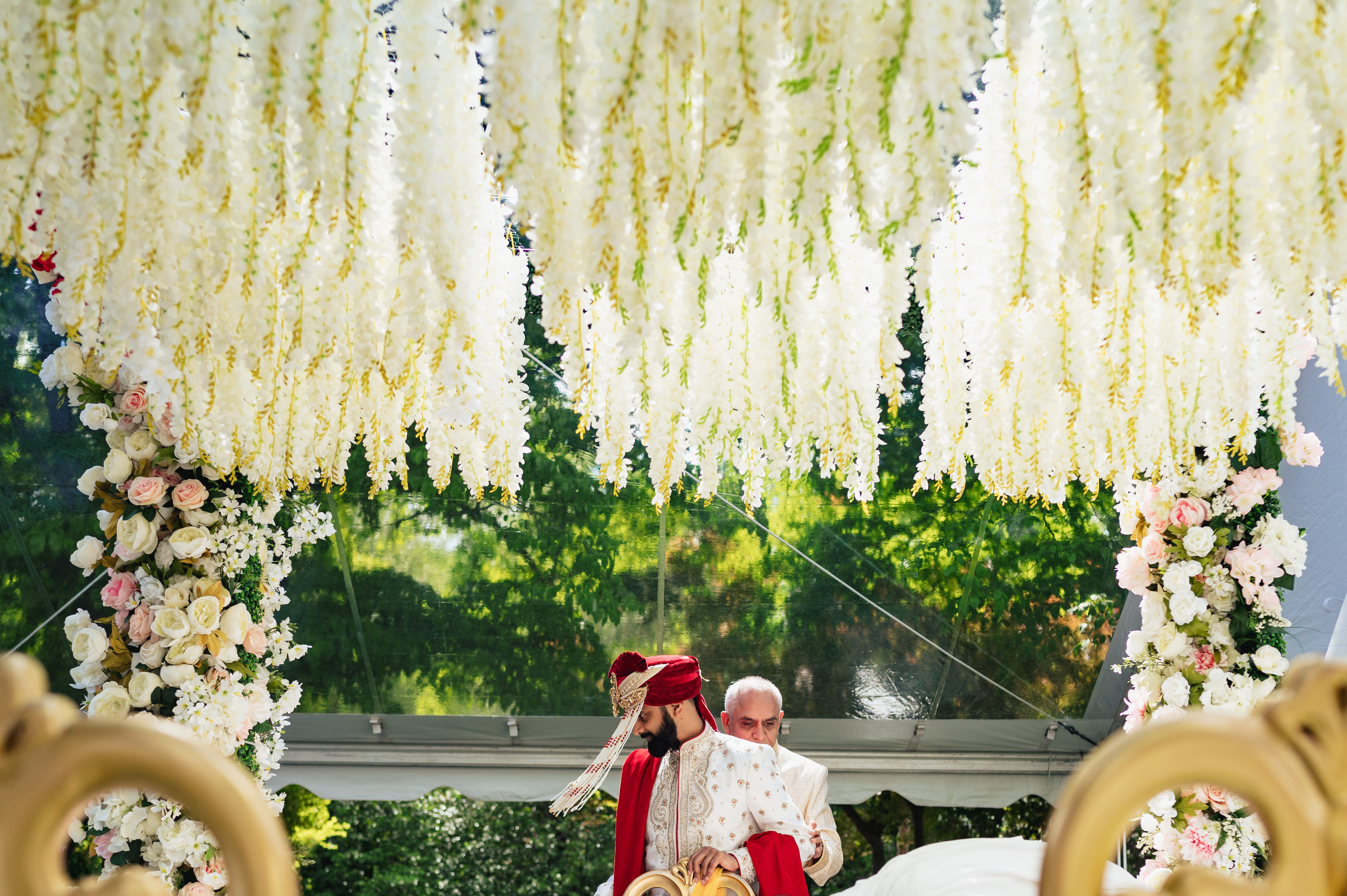The ceremony was hosted at The Branch Museum in Richmond VA.  The Branch museum is such a beautiful venue with gorgeous architecture and a very pretty courtyard.  Due to the state restrictions and the guest count, we tented the grassy area for ceremony.  Having the tent up allowed the decorator to come out the day before and set up the Mandap. This is something to think about when you are hosting at venues that are not 24/7 like a hotel.  Had we not gotten the tent, which provided shelter days earlier,  there would not have been enough time in the morning for her to set up such an intricate structure.  The guests were served beverages, mango lassi, and lunch while traditional music played in the background.