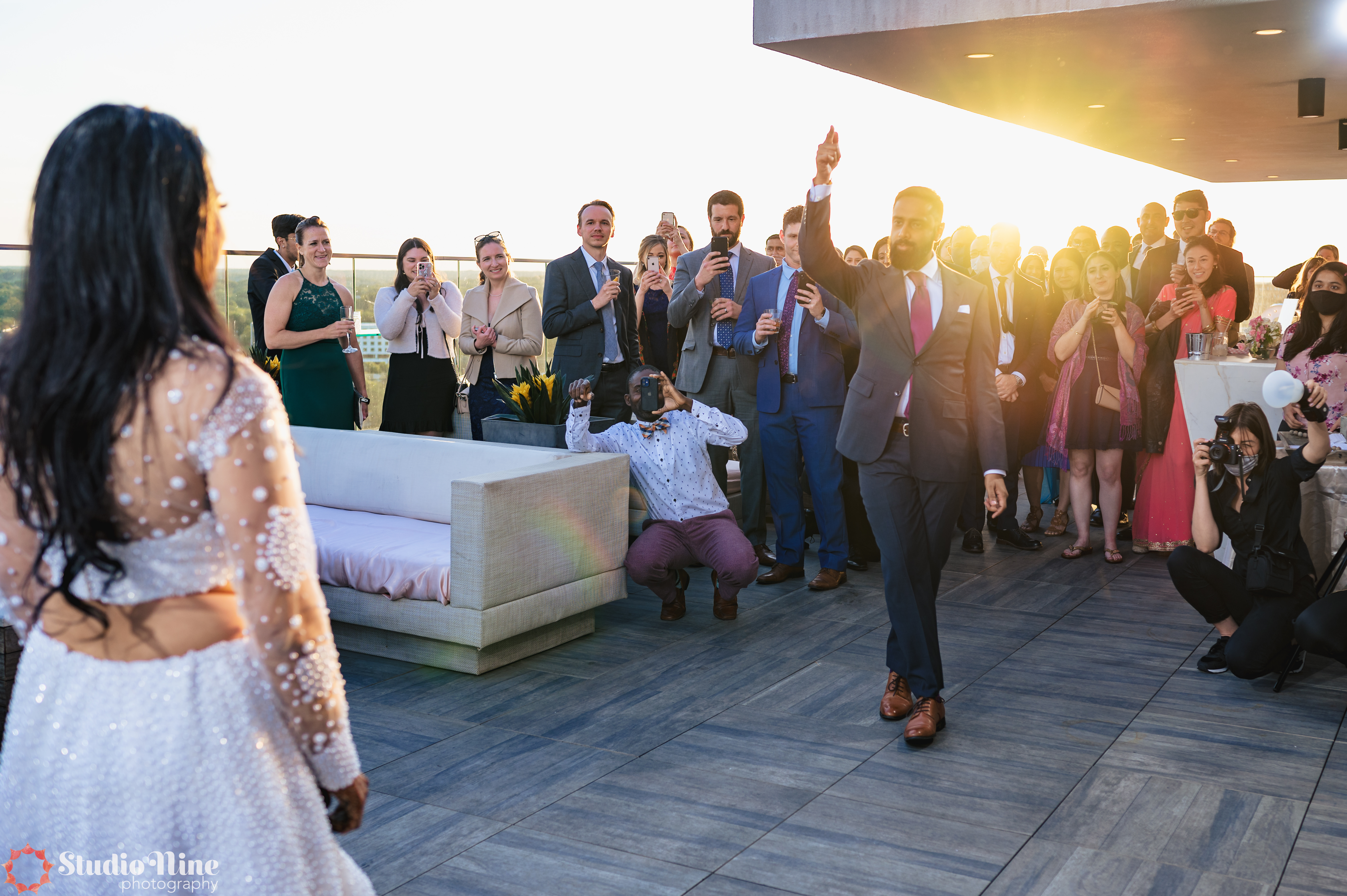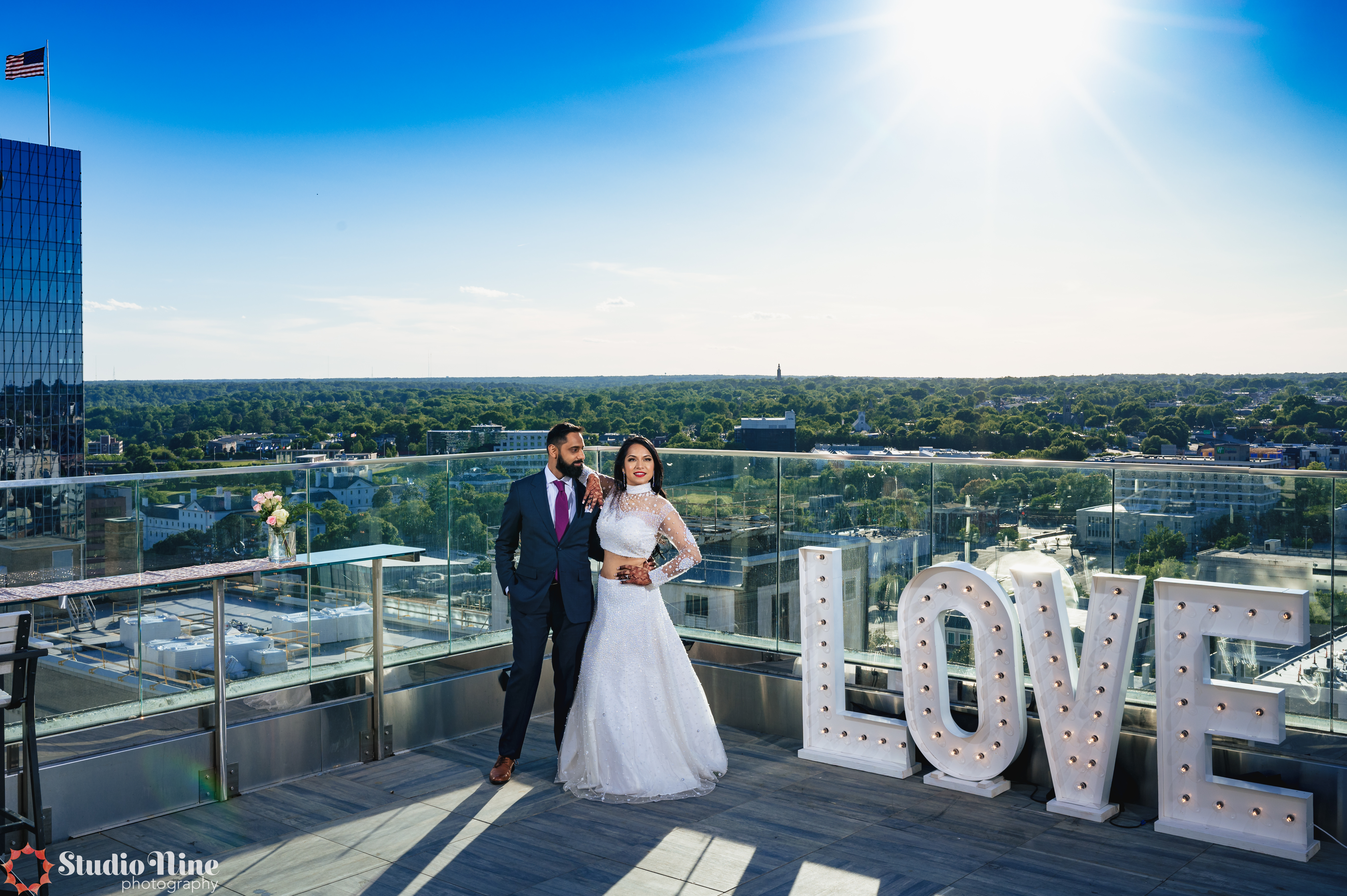 The reception and after party was hosted at Kabanas, a rooftop nightclub in Richmond VA.  Dolly, with Gulmohar weddings decorated the space, DJ Geeta played great party and dance music, Lehja catered, and the guests really enjoyed their evening on the roof.  The LOVE sign looked great lit up against the Richmond skyline.  All of the festivities and celebrations were captured by Studio Nine Photography.