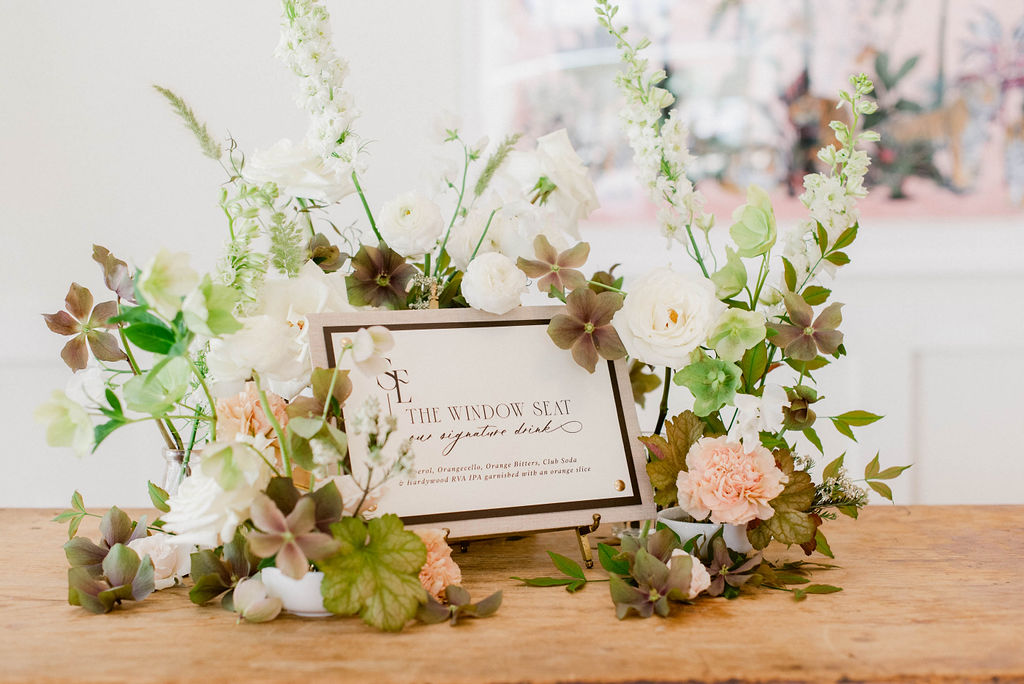 The actual bar is one that is on-site at The Common House. This is a great feature of this venue, as most venues bars are not as attractive. They also have some pretty amazing art on the walls that can be moved around. We moved the pink artwork behind the bar for this shoot. Curious Fox Press used bookbinding techniques to make the bar sign. This signature cocktail was inspired by the Window Seat, upstairs in the lounge area. The cocktail was displayed in Maison De Carine glassware, and the oranges brought in a touch of color and freshness.