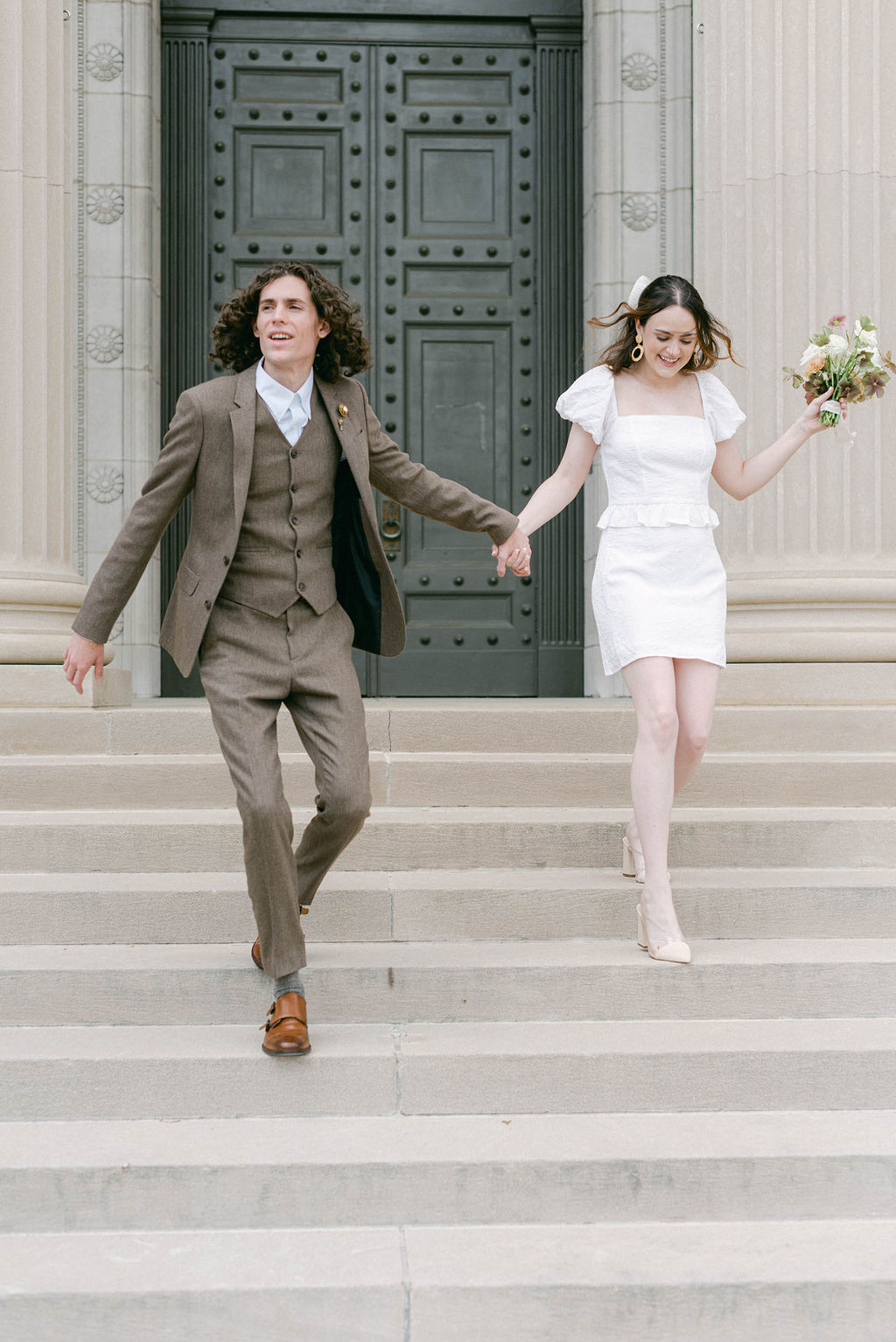 This couple is a bit minimal but still fashionable, so they opted for a micro dress, a large hair bow, cute block heels, and a beaded handbag in which to hold lipstick and a compact for quick touch-ups.  The groom wore a brown tweed three-piece suit, a vintage lapel pin, and brown oxfords with monk strap details.