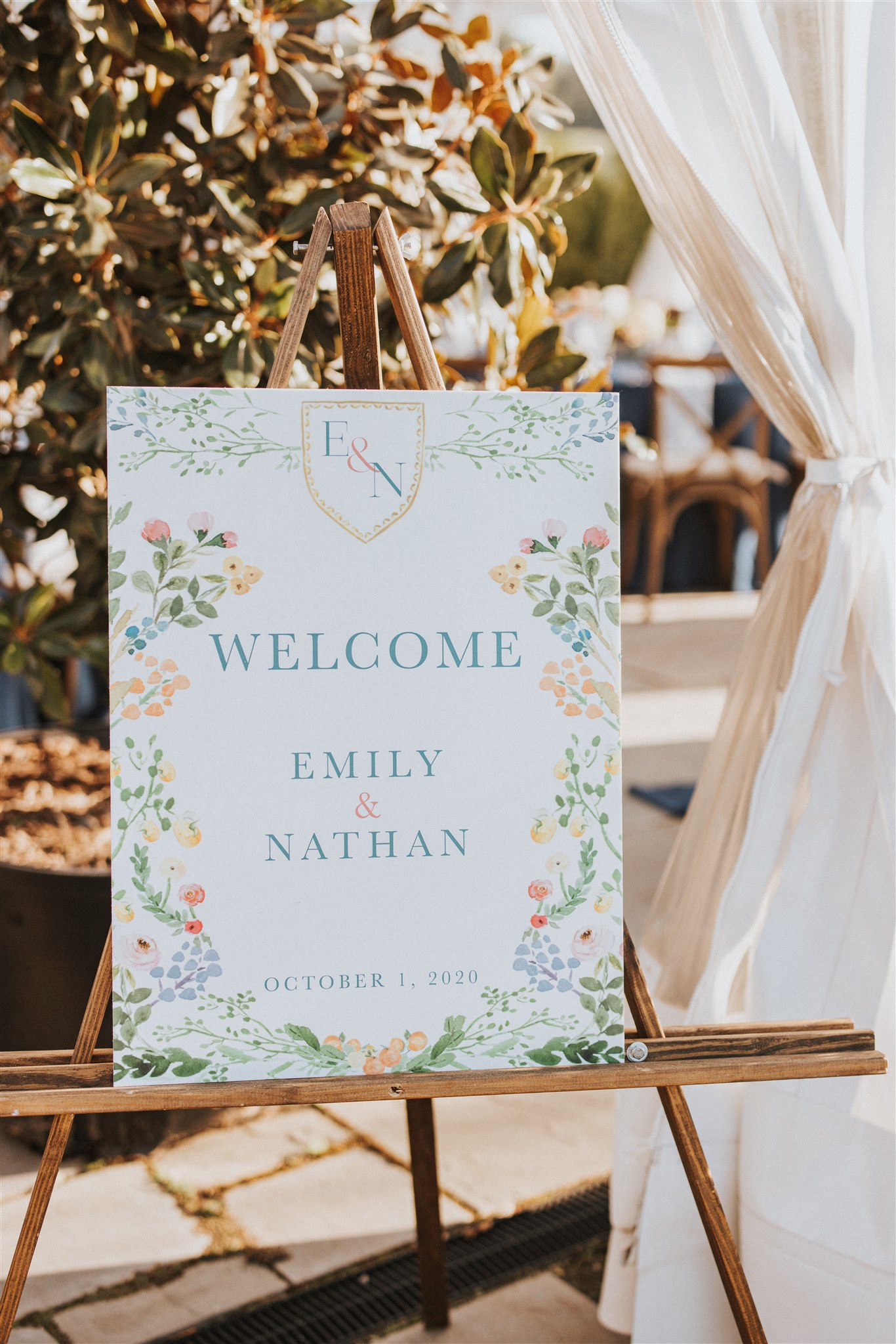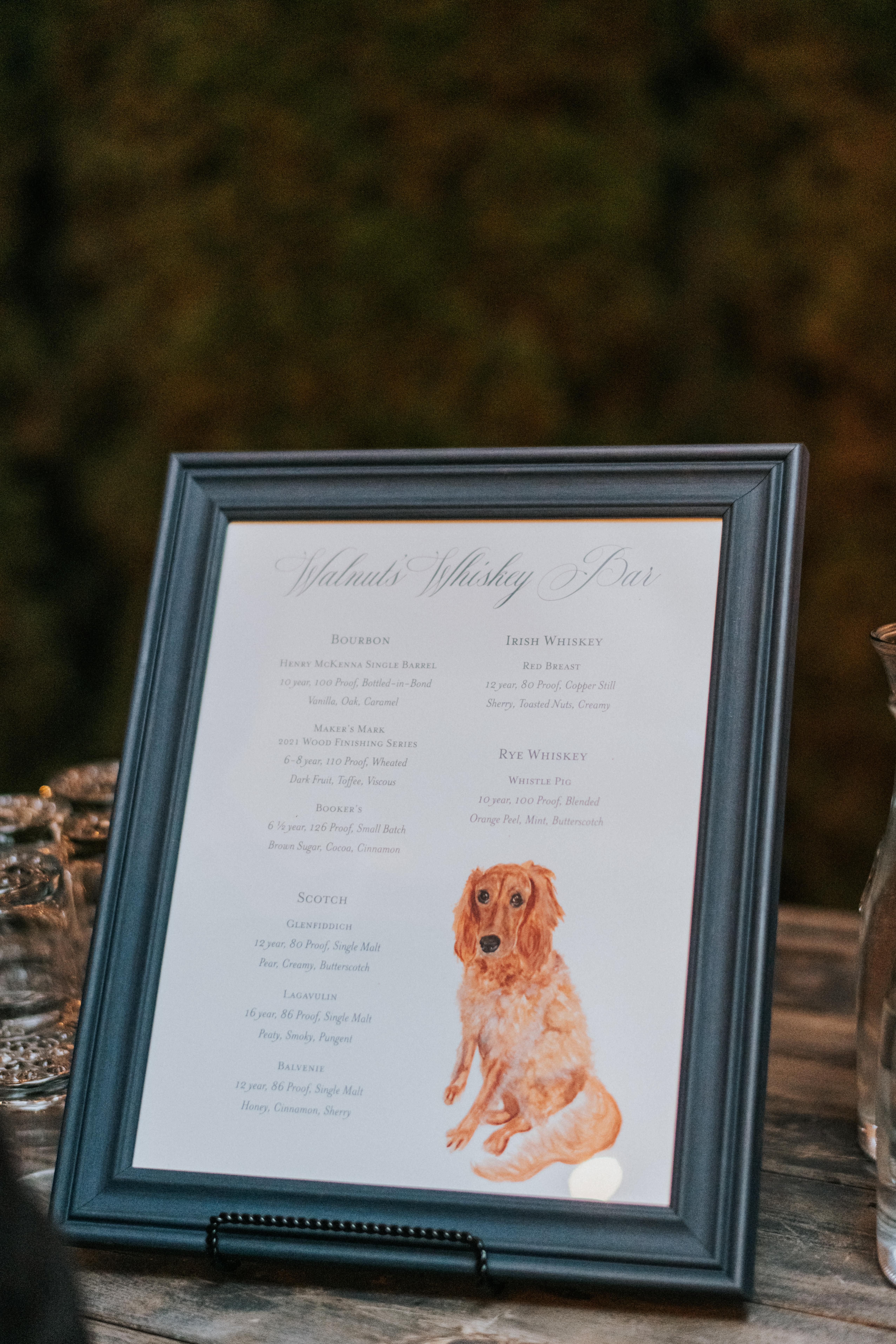 Their reception tables were wooden farm tables adorned with Grandmillennial pieces such as cut crystal, colored goblets, stunning colorful centerpieces. My favorite detail of all, hand-stitched table numbers that Emily spent months making. They also had homemade limoncello as their favor for their guests to pick up on the way out. Limoncello is an Italian lemon liqueur served as an after-dinner drink; the guests loved it. Dinner was a farm-to-table selection that perfectly fit Emily and Nathans’s personalities. Nathan is a whiskey connoisseur, and directly after dinner, a bourbon bar opened with specialized bourbons for guests to do a tasting. The bourbon selections were noted on a watercolor bar sign that had a portrait of their dog.