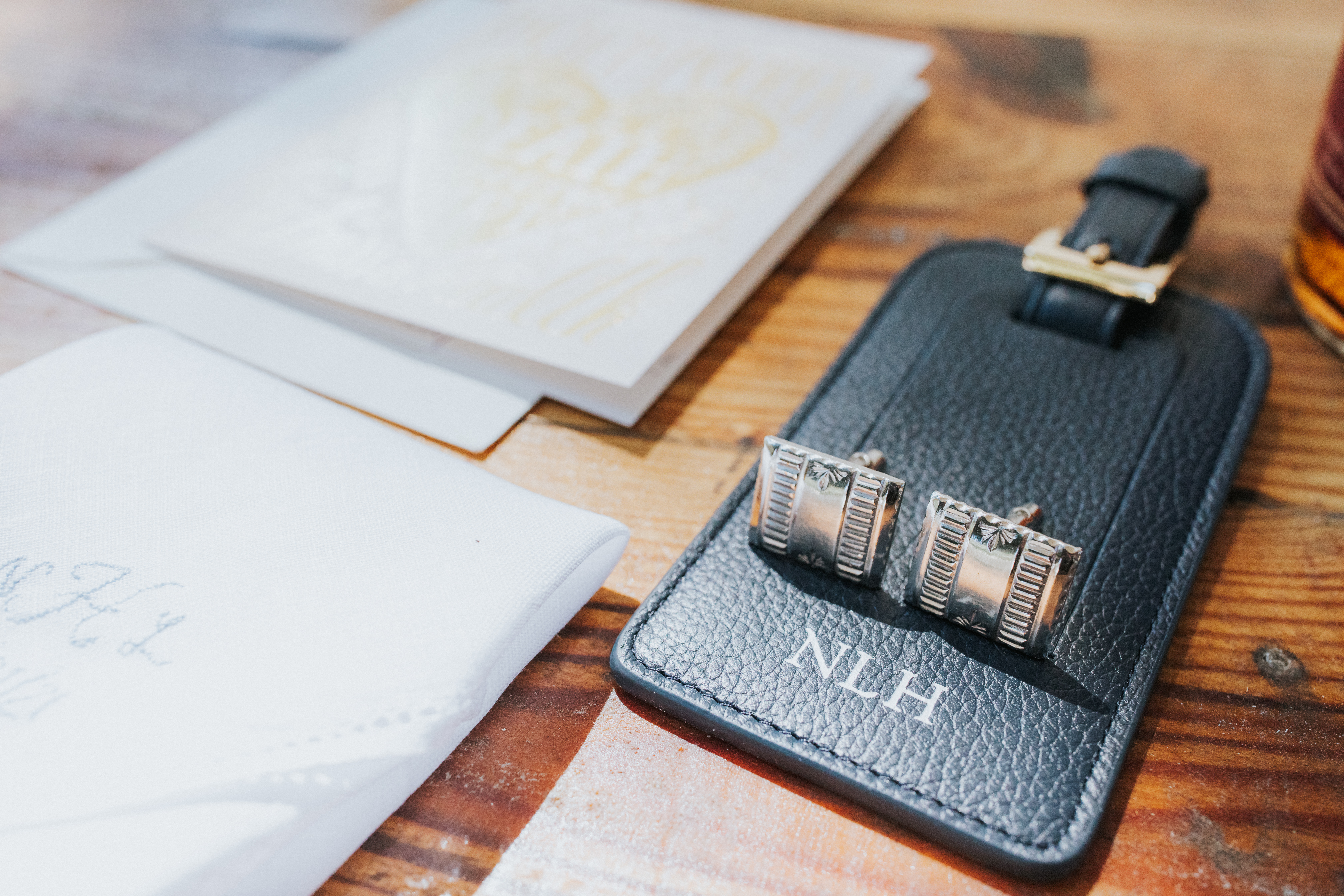 The morning of the wedding started with getting ready at two Airbnbs. Emily and her bridesmaids and Nathan and his groomsmen got ready for their wedding day at their respective houses; there were a lot of laughs while getting ready, mimosas, bourbon (Nathan’s favorite), and reminiscing. The getting ready portion of the day is such a fun time. You, your friends, and your family get to share in the excitement before walking down the aisle. Renting an Airbnb made the getting-ready space so much nicer than trying to cram everyone into a hotel room. They were able to have brunch catered and spread out their personal belongings. We were able to style their gifts, and there was still room for all of the fun and candid portraits.