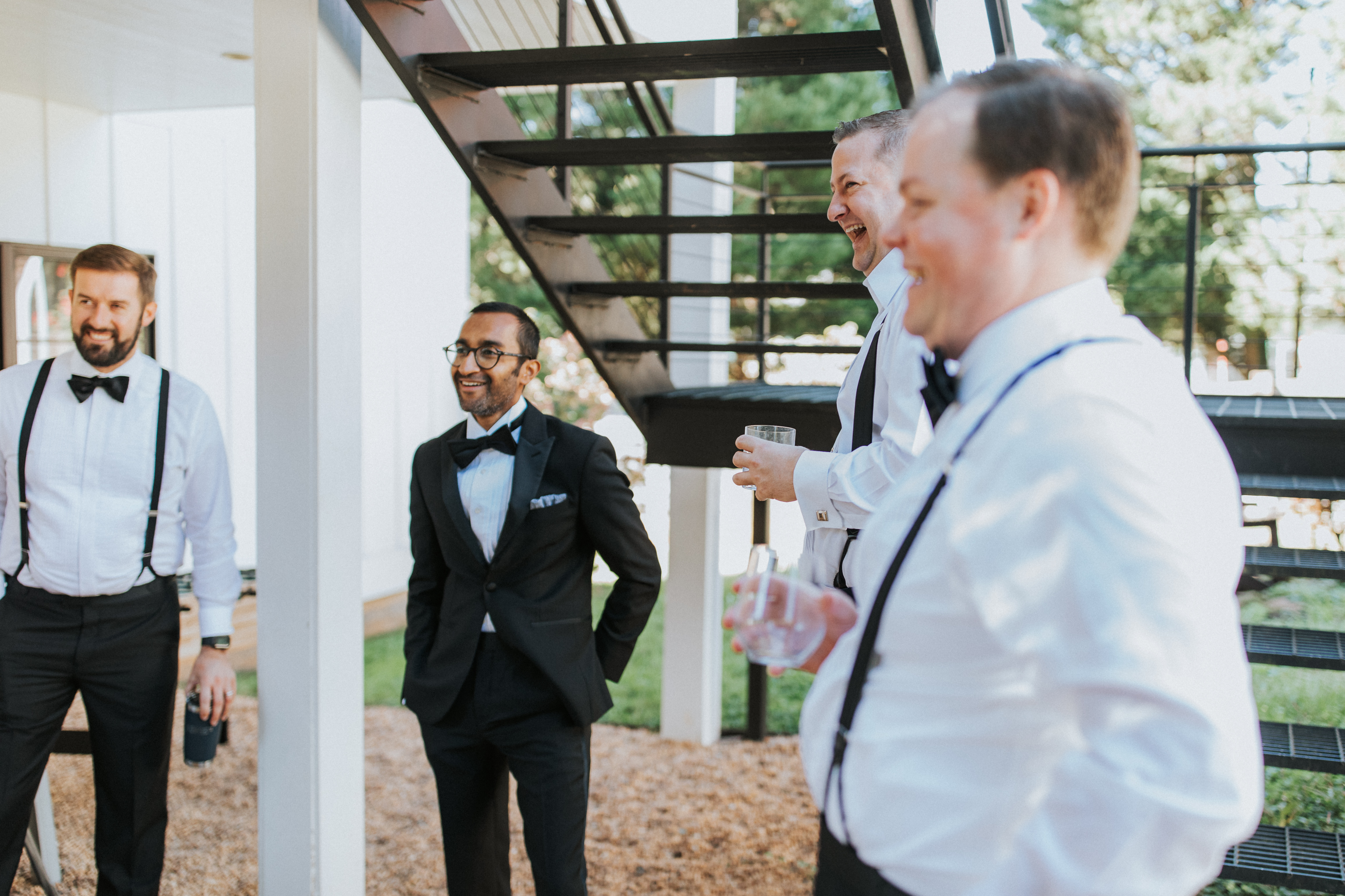 The morning of the wedding started with getting ready at two Airbnbs. Emily and her bridesmaids and Nathan and his groomsmen got ready for their wedding day at their respective houses; there were a lot of laughs while getting ready, mimosas, bourbon (Nathan’s favorite), and reminiscing. The getting ready portion of the day is such a fun time. You, your friends, and your family get to share in the excitement before walking down the aisle. Renting an Airbnb made the getting-ready space so much nicer than trying to cram everyone into a hotel room.  They were able to have brunch catered and spread out their personal belongings. We were able to style their gifts, and there was still room for all of the fun and candid portraits.